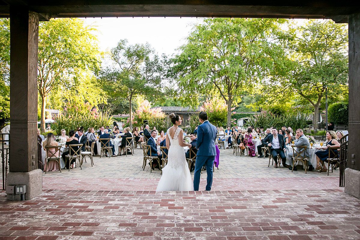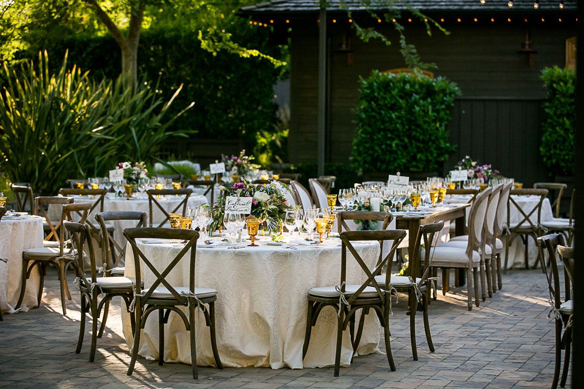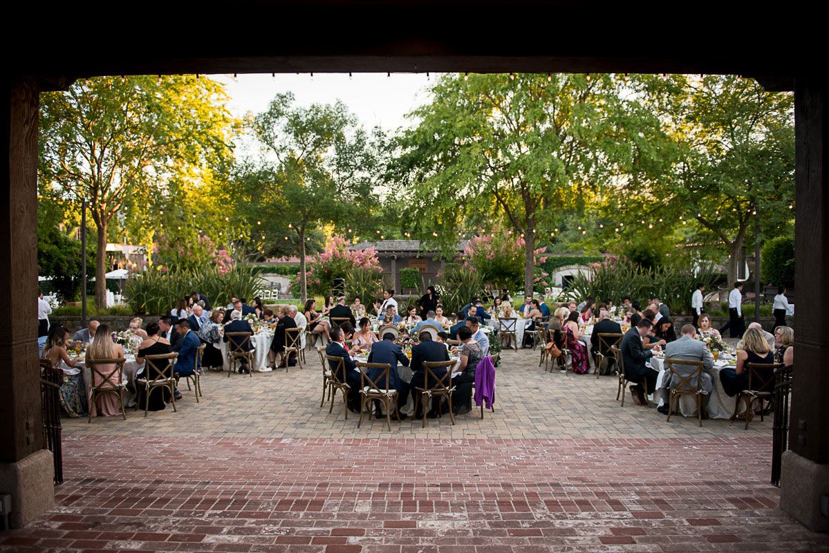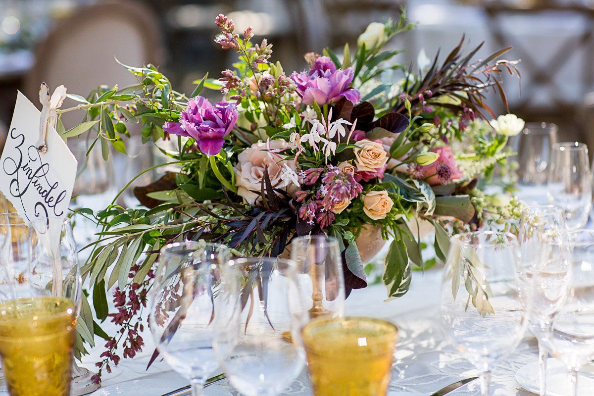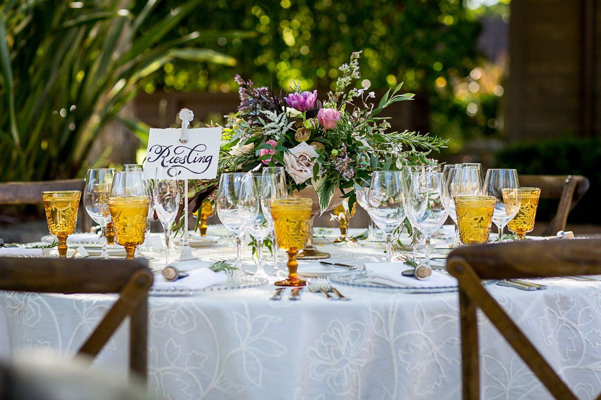 For their outdoor wedding ceremony, Erika and Dinh chose the Vintage Estates Pavilion. The Pavilion has a terraced gardens, lush lawns and Italian-style pergolas over raised stage areas. This combination makes The Pavilion at Vintage Estates Yountville a perfect spot for a wedding ceremony and reception. There are two spaces- the East Pavilion and West Pavilion- which can be used as separate areas for the ceremony and reception. For the wedding ceremony, the team of Napa Valley Custom Events complimented the existing beauty of the pavilion by adding elegant draping and a charming chandelier to the pergola. The brick walkway leading to the pavilion stage was flanked on each side by floral arrangements on tall pedestals designed by Julie Stevens Design. The minimal decor elements blended with the natural beauty of the space creating the quintessential wine country wedding style. The wine country wedding style carried seamlessly into the wedding reception decor. Round tables, named for wine varietals, were topped with embroidered ivory linens creating a base from which bright colors could pop. Honey-colored glassware, gold vessels full of wild greenery and purple blooms and rustic wooden chairs anchored the style and design of the wine country wedding reception. Menus were set at each place topped with a sprig of rosemary and a heart-topped wine bottle stopper. As the sun set over the Vintage Estates Yountville, wedding guests were invited to The Barrel Room for dessert and dancing. The Barrel Room boasts rustic character with brick walls, a beam and rafter ceiling and wrought iron chandeliers. Cozy seating areas were set along with cocktail tables and chairs. Dancing the night away in a historic barrel room is the perfect ending to a wine country wedding celebration.