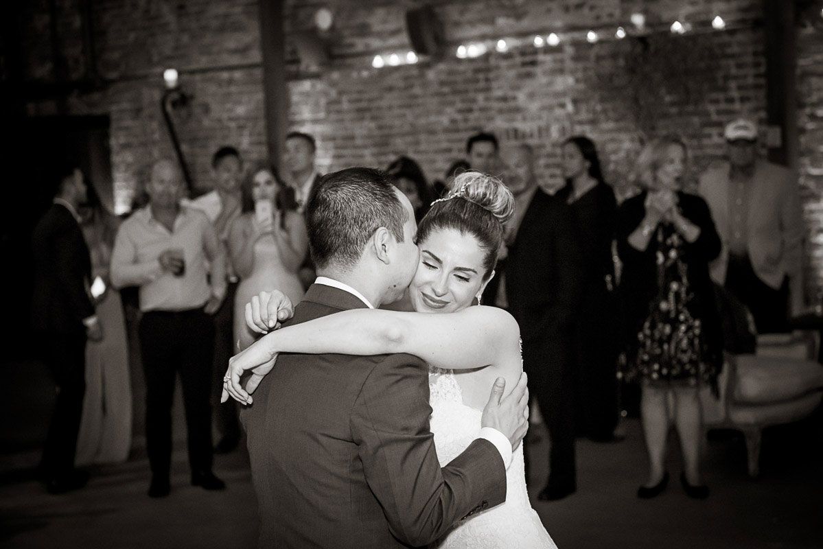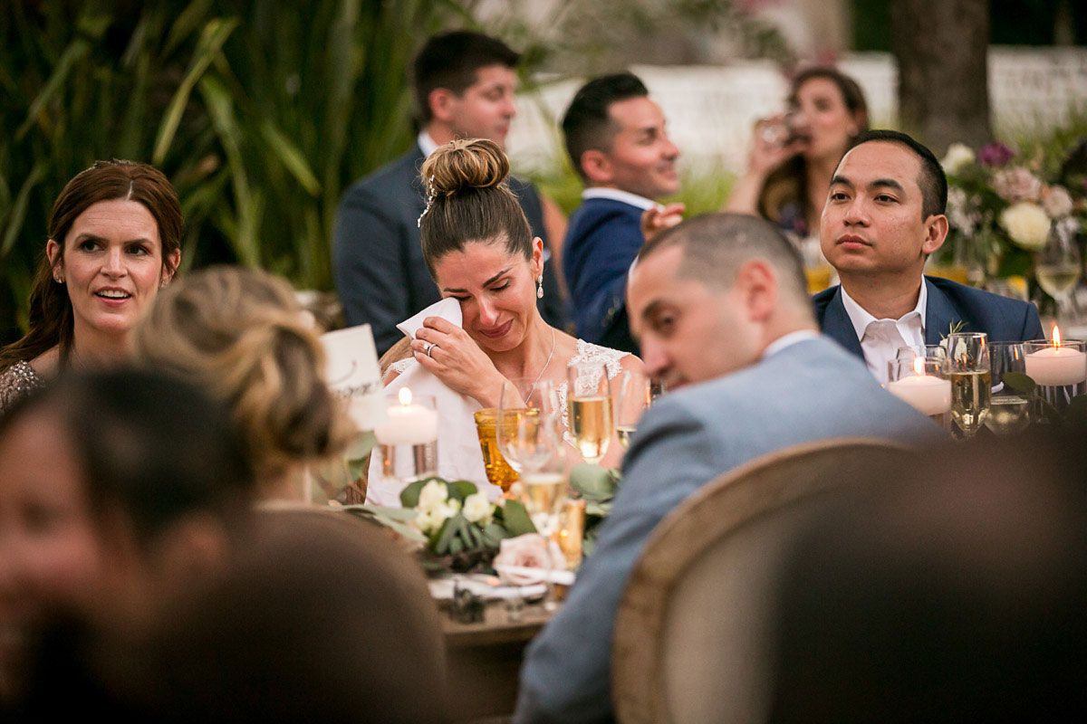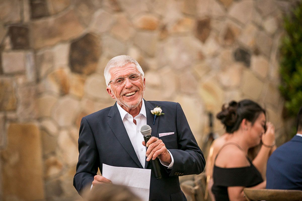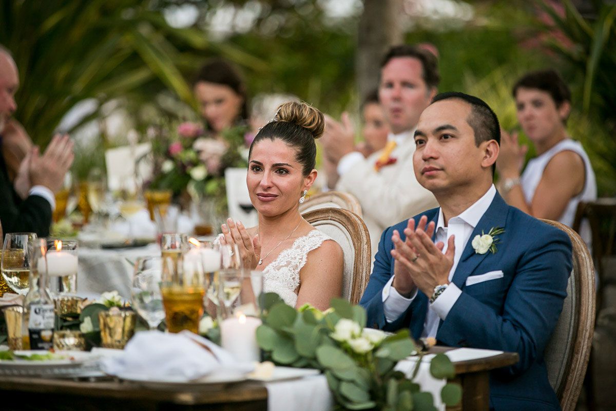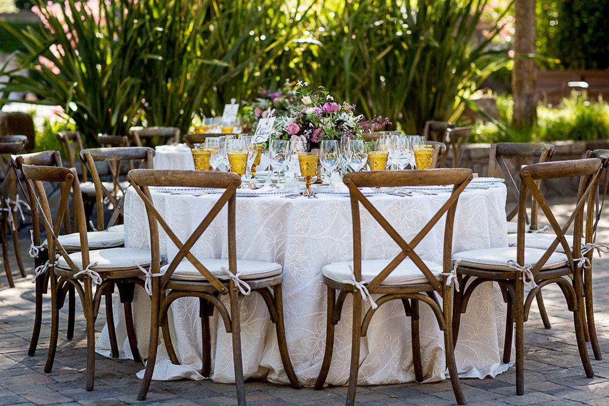 For their outdoor wedding ceremony, Erika and Dinh chose the Vintage Estates Pavilion. The Pavilion has a terraced gardens, lush lawns and Italian-style pergolas over raised stage areas. This combination makes The Pavilion at Vintage Estates Yountville a perfect spot for a wedding ceremony and reception. There are two spaces- the East Pavilion and West Pavilion- which can be used as separate areas for the ceremony and reception. For the wedding ceremony, the team of Napa Valley Custom Events complimented the existing beauty of the pavilion by adding elegant draping and a charming chandelier to the pergola. The brick walkway leading to the pavilion stage was flanked on each side by floral arrangements on tall pedestals designed by Julie Stevens Design. The minimal decor elements blended with the natural beauty of the space creating the quintessential wine country wedding style. The wine country wedding style carried seamlessly into the wedding reception decor. Round tables, named for wine varietals, were topped with embroidered ivory linens creating a base from which bright colors could pop. Honey-colored glassware, gold vessels full of wild greenery and purple blooms and rustic wooden chairs anchored the style and design of the wine country wedding reception. Menus were set at each place topped with a sprig of rosemary and a heart-topped wine bottle stopper. As the sun set over the Vintage Estates Yountville, wedding guests were invited to The Barrel Room for dessert and dancing. The Barrel Room boasts rustic character with brick walls, a beam and rafter ceiling and wrought iron chandeliers. Cozy seating areas were set along with cocktail tables and chairs. Dancing the night away in a historic barrel room is the perfect ending to a wine country wedding celebration.
