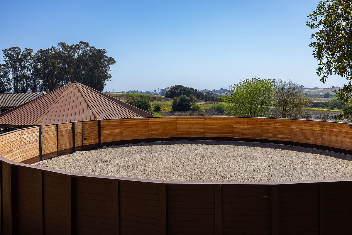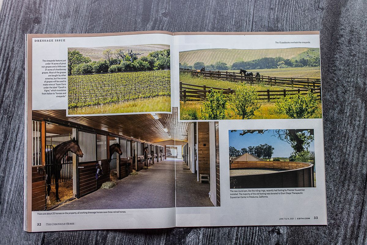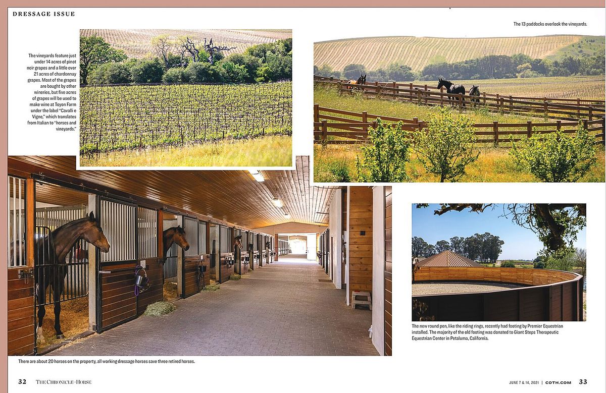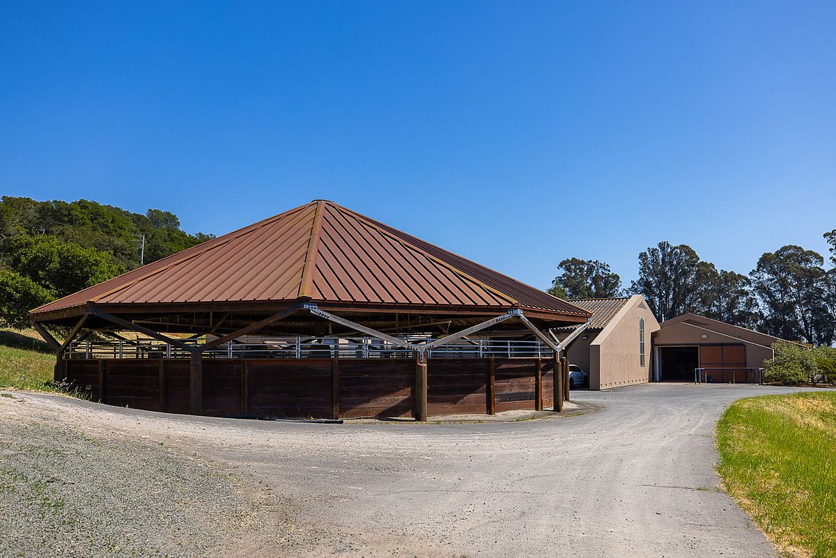 Toyon Farm is nestled in Carneros wine region, between Sonoma and Napa wine country. The driveway is lined with eucalyptus trees, as you arrive at the gate, you get a peek-a-view view of the arena at the top of the property. Both winery and equestrian facility, it has breathtaking views of the vineyards and Napa Valley countryside.Â
