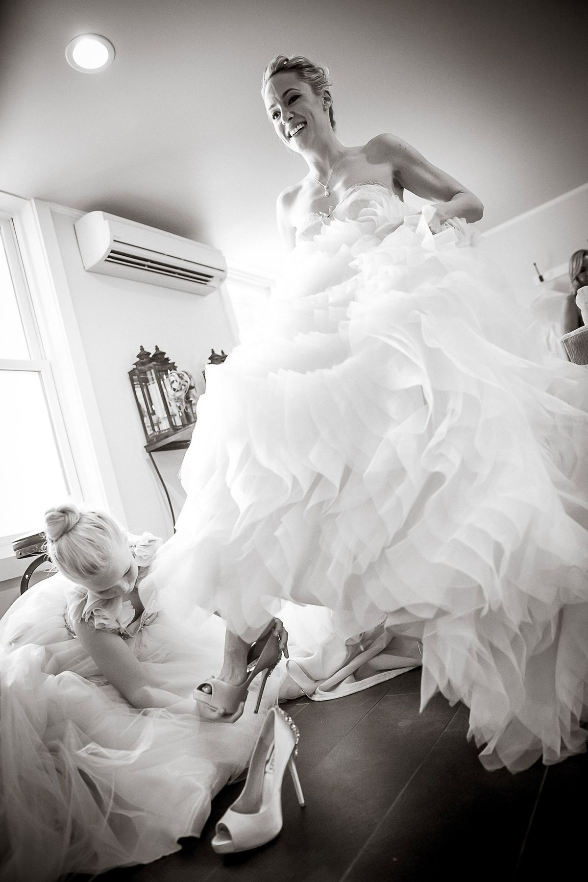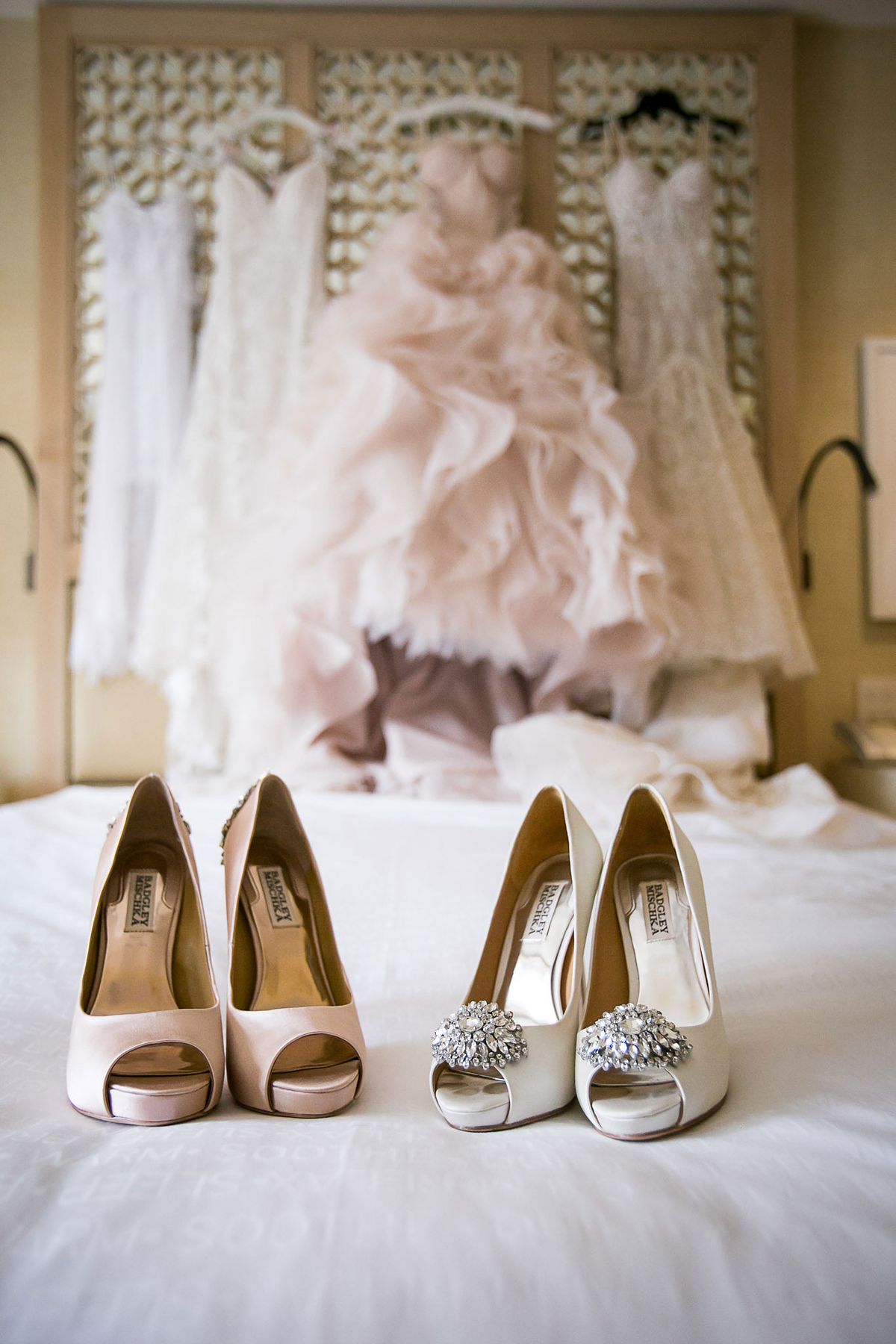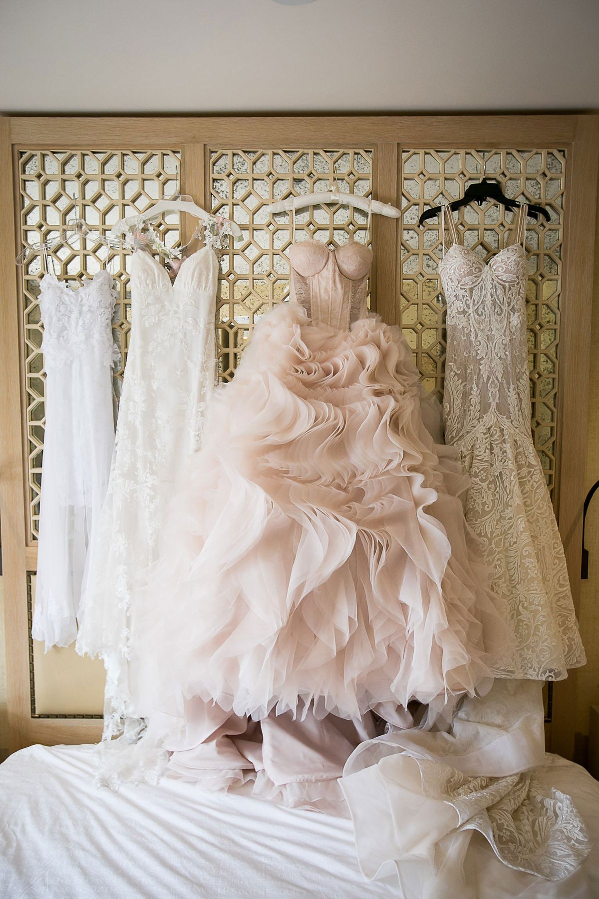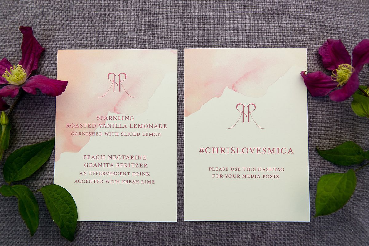 Below you'll see the highlights from Mica and Christopher's gorgeous wedding. Mica, an actress and dancer, is absolutely stunning and awed guests by wearing 4 different gowns. The fluffy pink ballgown worn for the ceremony is from the Lazaro Bridal Collection. The second gown, a Claire Pettibone, was worn during cocktail hour in the garden. When Mica donned the third gown from Bertabridal, it was time for portraits in the vineyard and the evening reception. Finally, for dancing the night away, Mica opted for a short dress from Grace Loves Lace.