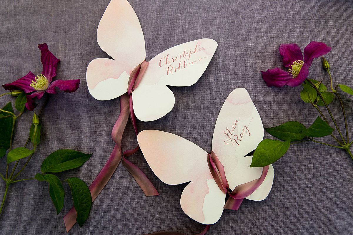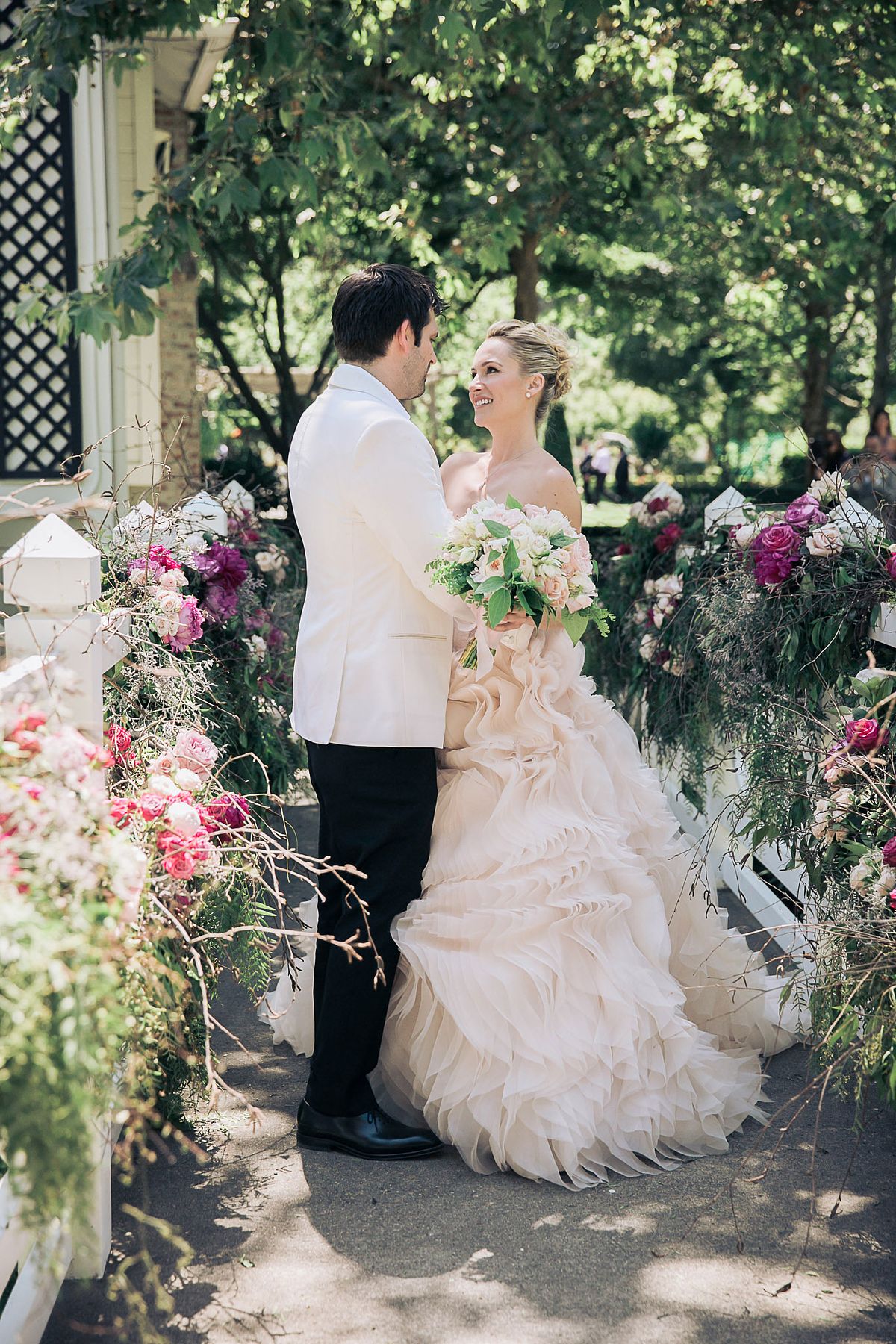The drive up to the estate is lined with sycamore trees providing a canopy entrance. Upon arrival, guests walk down a long lane lined with a white picket fence, which you’ll see below has been adorned by the fabulous Kathleen Deery Designand team. Passing the fence brings guests to the lovely and lush green cocktail reception area; then its on to the ceremony space centered around a beautiful pool with stone cherub fountains. Walking across a white bridge under an arbor takes guests to the reception area where dining tables are set beneath an immense sycamore arbor. Late night dancing commences underneath a starlit sky. A perfect romantic evening.